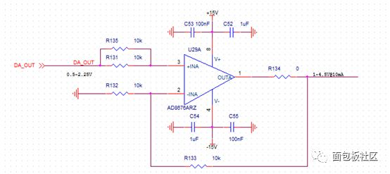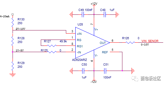 采集4-20mA电流,得到1V-5V电压差,放大2倍后进入后级ADC。为了防止电阻功耗过高,R128,R129,R130三个电阻采用了并联取值的方式,最终取到了250Ω这个值。