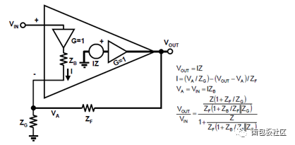 它与VFA区别是,输入端不再是两个都虚断,反相输入电阻ZB是个非常小的值,但又绝对不能认为是零;它的开环增益Gout不再是非常大,而是约等于1;它的跨阻Z可以认为是无穷大。
