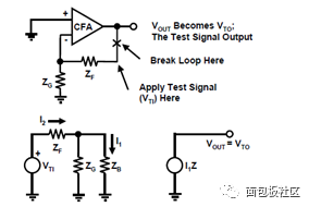 当没有反馈电阻ZF的时候,A约等于1,ZF趋近于0,Aβ趋近于无穷,增益趋近于0,和想要的跟随电路完全不一样,也就是网上常说的“CFA不加反馈电阻就没信号”。(没找到这句话,忘记是在哪里看到的了,只能看下CFA手册上对反馈电阻的介绍)