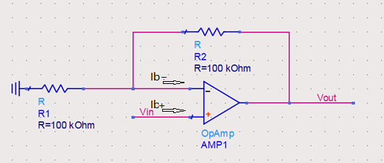 对于,正向输入端来说,Ib+带来偏置电压几乎等于0,而对于反向输入端来说,Ib-带来的偏置电压等于350mV(计算时,假设Vout接地,相当于R1//R2)。因此,需要的是在正向输入端增加一个电阻,来补偿反向输入端带来的误差。