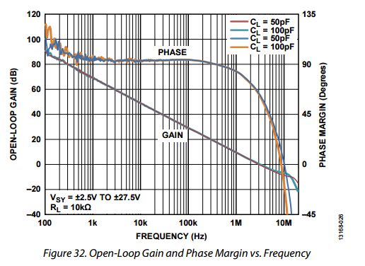 这时,我们并上一个电容,相当于人为引入一个零点,把拉下去的相位,拉上来,但是,这个分布电容一般很小,使得它环路增益Aβ等于1的位置非常远,在这么远的频点上,运放早就不能正常工作了。而看手册这个运放自身在100k的时候,相位余量相当的高,超过了90°,完全不需要增加额外的补偿电容。
