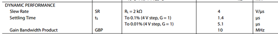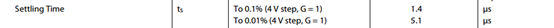 看一下运放的指标,当4V时,达到0.01%,时间为5.1μs,此时带来的波动误差是0.4mV,而在4V范围内,一个16位ADC的1LSB为0.06mV。误差可以吃掉6,7个码字,如果再加上分布电容和走线电阻,这个时间会进一步增加,使得后级稳定时间增长,从而导致误差变得更加的大。