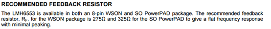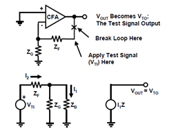 当没有反馈电阻ZF的时候,A约等于1,ZF趋近于0,Aβ趋近于无穷,增益趋近于0,和想要的跟随电路完全不一样,也就是网上常说的“CFA不加反馈电阻就没信号”。(没找到这句话,忘记是在哪里看到的了,只能看下CFA手册上对反馈电阻的介绍)
