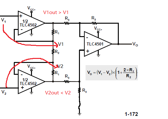 正相输入电压和反相输入电压体现在仪放内部的R2处,而真正进行输出的电压,是由V1out和V2out体现的,换一句话说,最终增加的电压值平分为两份,一份由V1out提供,它会比V1高,另外一份由V2out提供,它会比V2低。