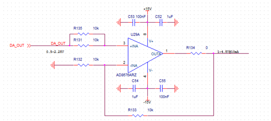 采集4-20mA电流,得到1V-5V电压差,放大2倍后进入后级ADC。为了防止电阻功耗过高,R128,R129,R130三个电阻采用了并联取值的方式,最终取到了250Ω这个值。