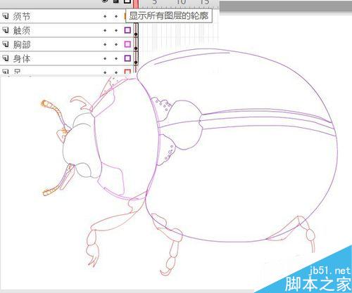 1、用线条工具分层画出瓢虫的线描。我这里是完成后的图,所以显示的是轮廓。
