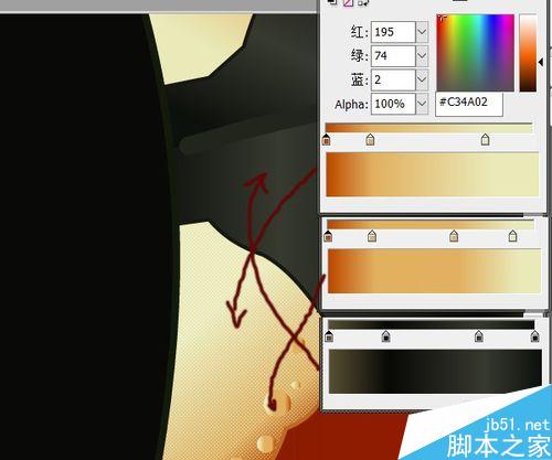 7、为胸甲填充黑色,按图中填充条设置色标,添上黄斑。左侧黄斑可用纯色,也可将渐变填充拖至最浅色。
