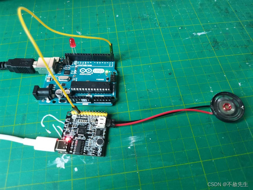 最后连接二块板子TX到RX连的连接线,通上电源后,喇叭会发出“我们正在进行实验,请呼唤我“不赦先生”唤醒我”。然后我们呼叫“不赦先生”,LU-ASR01板会通过串口发出’hello’,Arduino收到’hello’后,LED灯会闪3下后熄灭。接着我们可以呼叫“打开灯光”,LU-ASR01板会通过串口发出’t001’(同时播报:已请阿杜打开灯了),Arduino收到’t001’后,就会点亮LED灯,我们可以再呼叫“关闭灯光”,LU-ASR01板会通过串口发出’t002’(同时播报:已请阿杜关闭灯了),Arduino收到’t002’后,就会熄灭LED灯。
