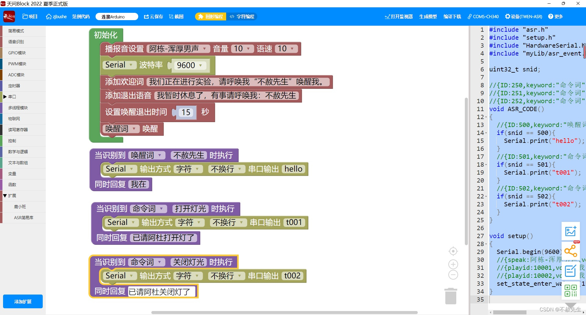 下面说一下程序的实现方法。首先我们对LU-ASR01进行编程,通过“天问block”的图形化编程实现。程序编写和烧录过程略过(注意一点:烧录程序前,务必断开二块板子TX到RX连的连接线),读者可自行查看相关资料。下面给出在“天问block”上的完整程序: