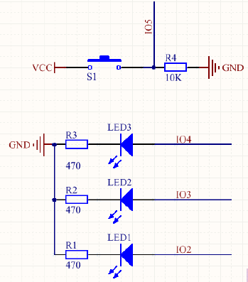 3个LED自由闪烁 当 按住轻触开关 停止闪烁。