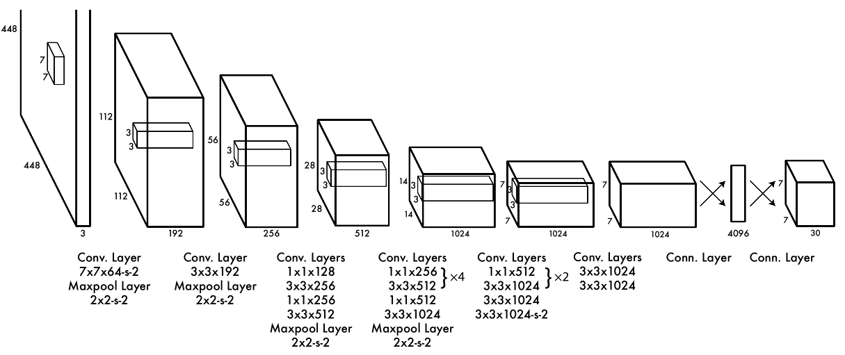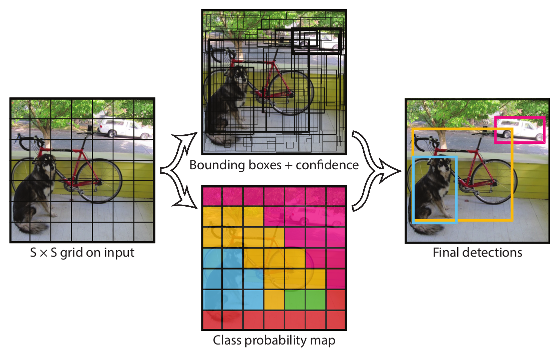 上图中左图作为输入图像,被分成了 7 × 7 个小的栅格,后续的工作和这些栅格息息相关。