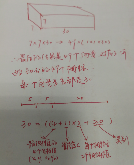 YOLO的网络结构很简单,前面是一个已经预训练的全卷积网络,后面又增加了4个卷积层,最后加了两个全连接网络,生成的结果就是刚才提到的 7 × 7 × 30 。7 × 7 × 30 的结果分成30个向量,结果的含义如下图(画图太麻烦了,就手写了):
