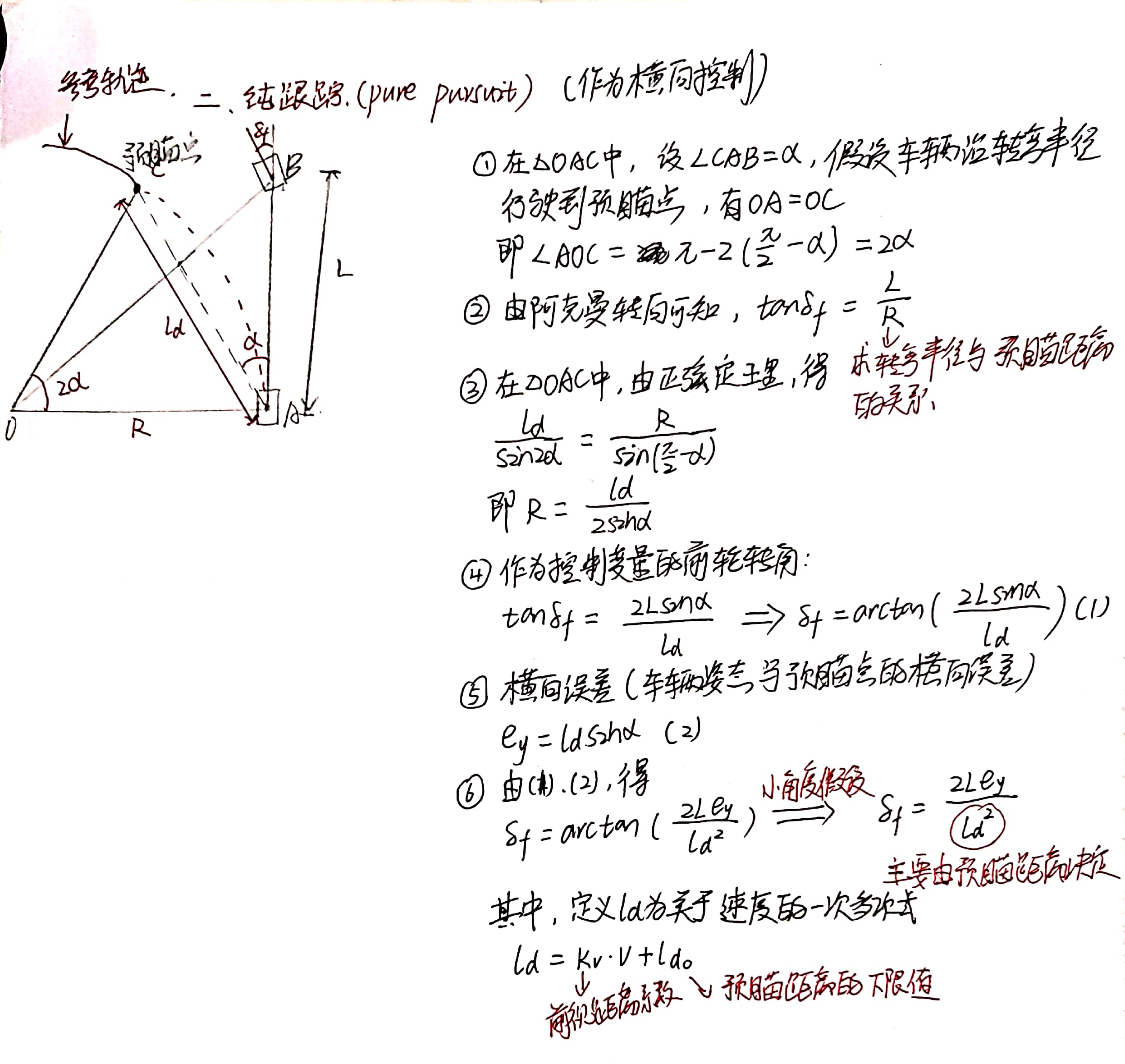 - 缺点:1. 跟踪性能严重依赖预瞄距离的选择,最优值很难获取。2.纯追踪算法是基于简单的几何学模型,并未考虑车辆动力学特性和转向执行器动态特性。高速下转向曲率的快速变化易使车辆产生侧滑,系统模型与实际车辆特性相差较大会导致跟踪性能恶化