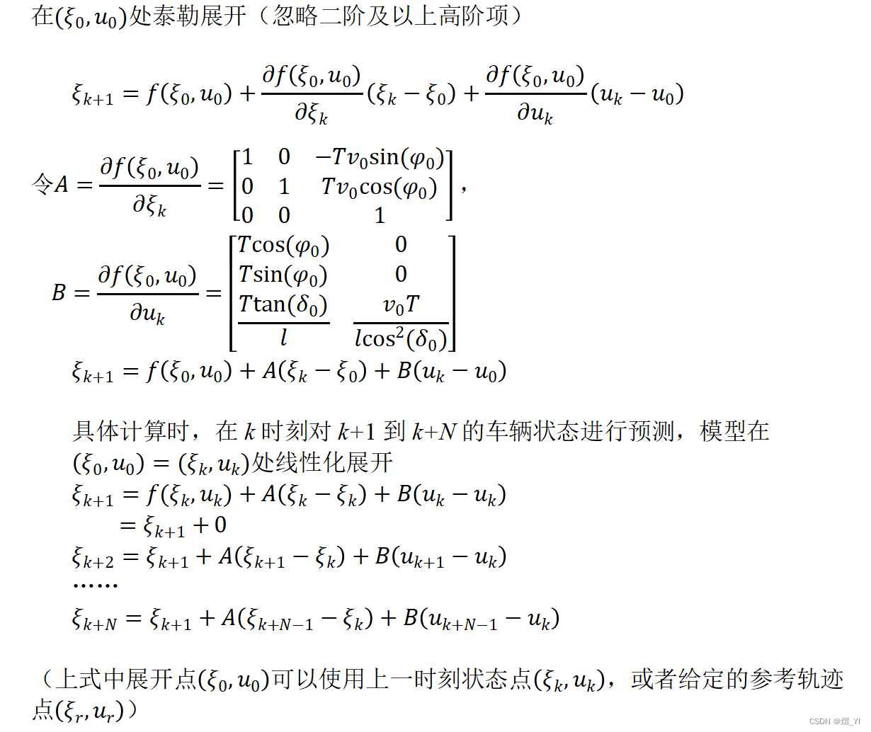这里使用针对状态轨迹的线性化方法(《无人驾驶车辆模型预测控制》(第二版)第五章代码所使用的方法),与第三、四章的存在参考系统的性线化方法略有不同,本质上区别不大,具体可以参考《无人驾驶车辆模型预测控制》(第一版)的介绍。