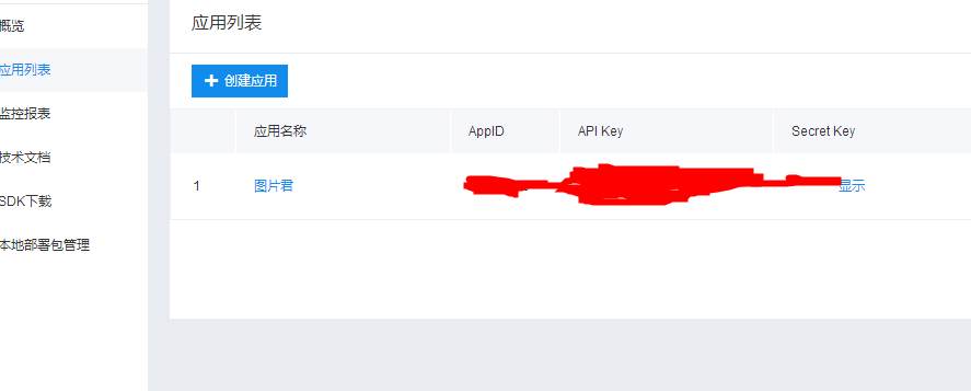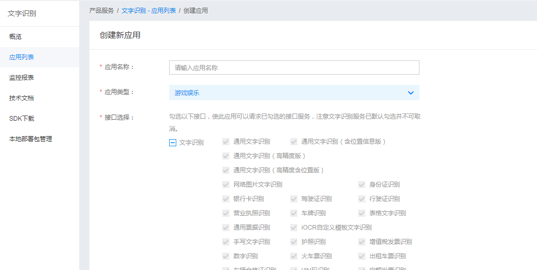 首先需要注册百度账号,并登录百度云,进入管理控制台,创建文字识别应用,如下图