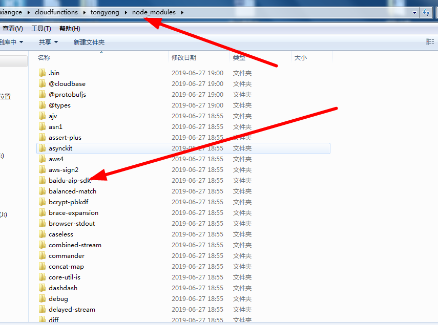 由于百度提供了node.js的api,而小程序服务端云函数正是基于node的开发,在小程序开发工具云函数目录下打开终端导入文字识别api,命令:npm install baidu-aip-sdk,下载完成后,可在云函数目录看见node_modeules中‘baidu-aip-sdk’ api。