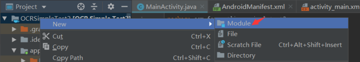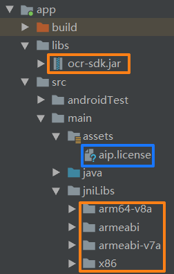 将下载的 aip-ocr-android-sdk-1.4.4 文件夹 libs 子文件夹里 arm64-v8a, armeabi, armeabi-v7a, x86 放到如下图 main 里新创建的 jniLibs 文件夹中,ocr-sdk.jar 放入 libs 中