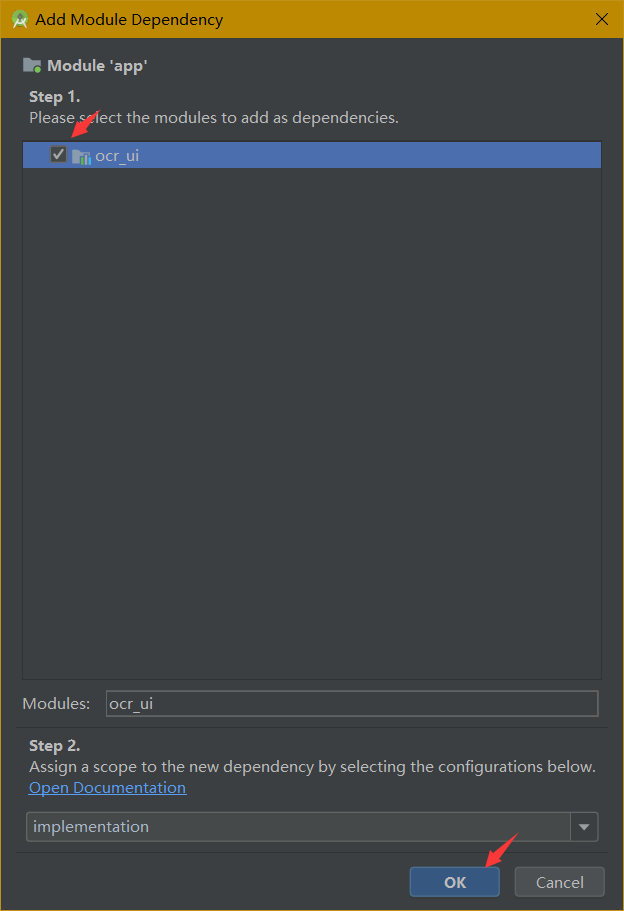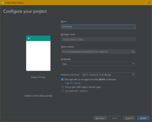 记得一定要设定文字识别包名为需要,同时包名为 Android Studio 创建 Project 的包的名字(Package name)
