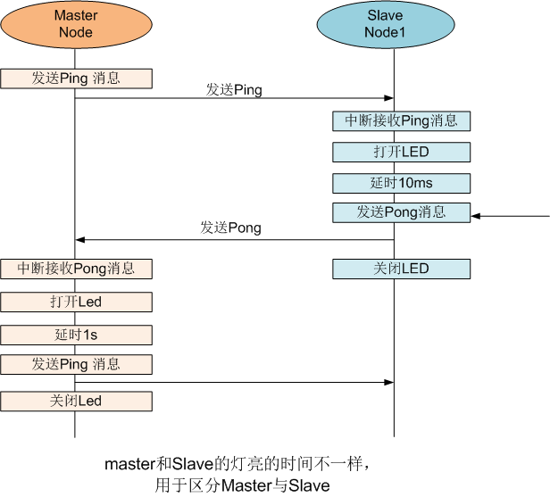 由于master和slave发送消息的延时不同,因此LED灯亮的时间也不相同。