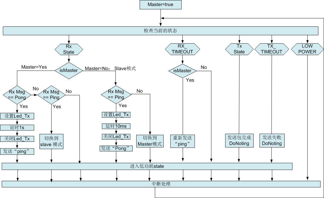 这样导致master1和master2始终处于5分钟接收Rx超时状态,超时后,两个节点,同时发送ping,同时进入接收状态,因此,任何一个节点,都无法进入slave模式。现象是:两个节点的接收LED灯都一直不闪烁,误以为程序没有执行。