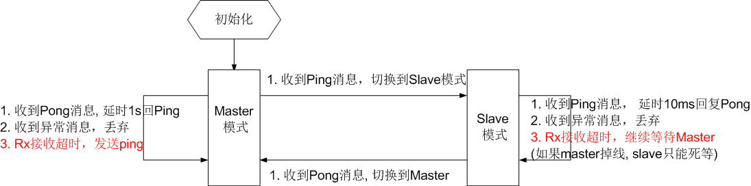 上电初始状态,每个节点默认是master模式,在启动的过程中,先发送ping的节点,就可能保持在master模式,而后启动慢一点的节点,会收到启动快一点的节点的ping消息,然后切换到slave模式。这样,就完成在启动过程中,master和slave角色的自动协商。