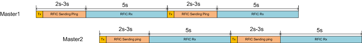 在上图中,master1和master2的启动时间相差无几,Master1正在发送ping消息的时候,master2也在发送ping消息,而RFIC收和发是不能同时进行的,在发送的时候,不能接收,在接收的时候,不能发送。