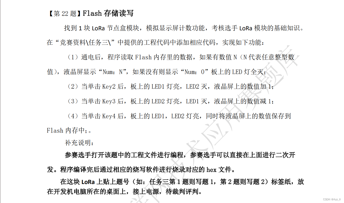 以上就是愉快柜子最近收集整理的关于Lora开发板Flash存储读写· 本文会介绍如何用Lora开发板一步步实现Flash存储读写(基于STM32L151C8T6芯片)一.看题二.读题,明白我门最终要实现成什么样的效果 题目的要求就是板子通上电,LED显示屏显示的数值就是存在Flash中的数,按下KEY2和KEY3可以对这个值进行加和减的操作,同时按下KEY2LED1亮LED2灭,按下KEY3LED1灭LED2亮,最后按下KEY4把可以把这个值存到Flash中并且LED1、LED2同时亮。三.解题步骤· 拿到物联网竞赛的全部内容,更多相关Lora开发板Flash存储读写·内容请搜索靠谱客的其他文章。
