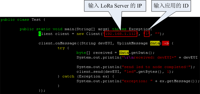 -- 编辑 Test.java:配置 LoRa Server IP,配置 AppID,如果需要,配置 Key