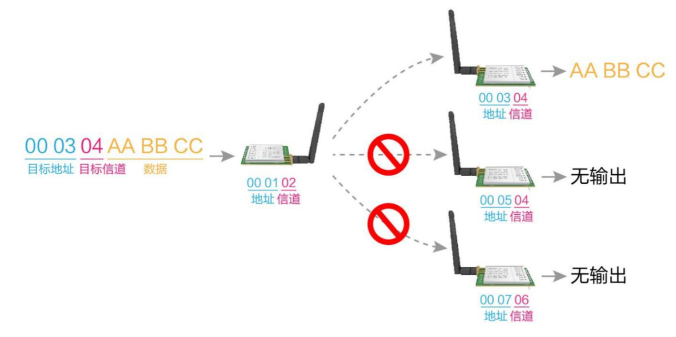 定点发送需要地址和信道相匹配时接收模块才能接收到数据,广播发送只需要信道匹配就能接收到数据。
