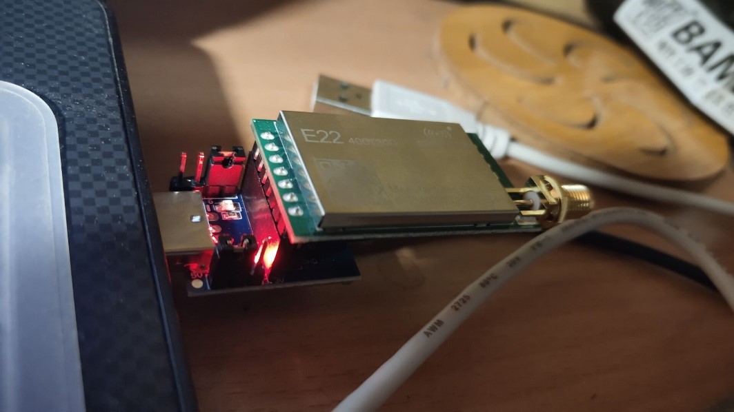 用厂家提供的LoRa模块测试套件,将左上角的跳线帽取下可进入配置模式