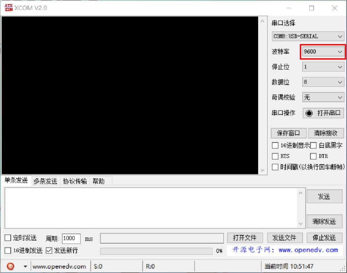将连好LoRa模块的USB转TTL模块插入上位机USB接口,打开串口调试助手,波特率设置为9600。