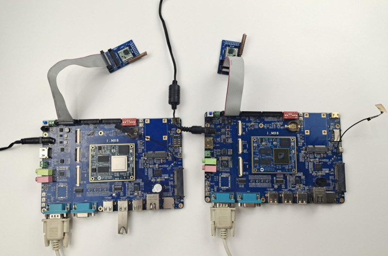6 在俩个开发板的串口终端分别运行命令, 如下图所示:
