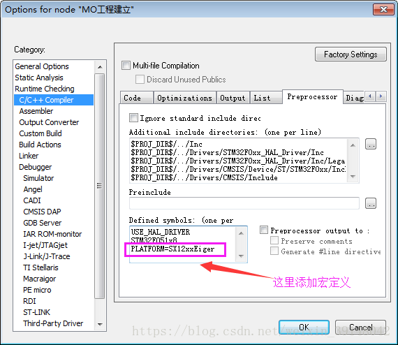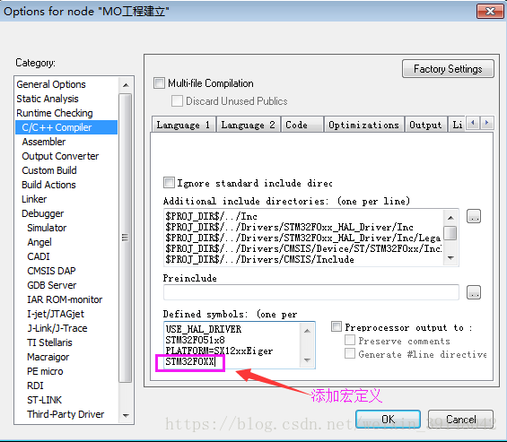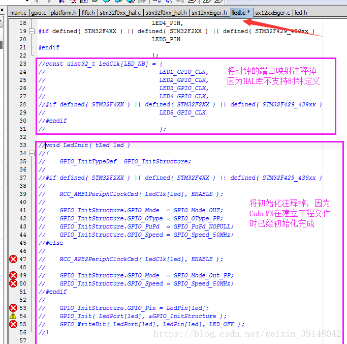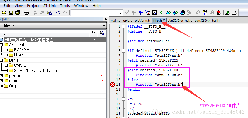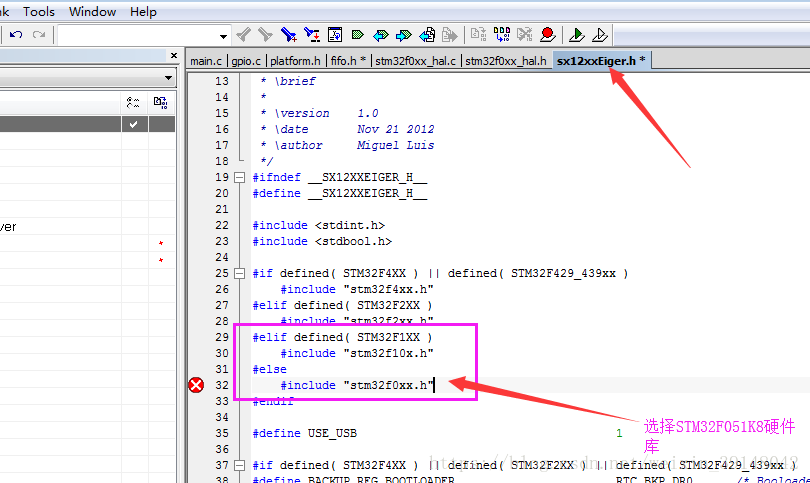 修改硬件平台:修改相关代码,并添加宏定义,选择我们实际使用的MCU硬件库(本项目中使用的是STM32F051K8)(先编译代码,然后根据错误提示修改)