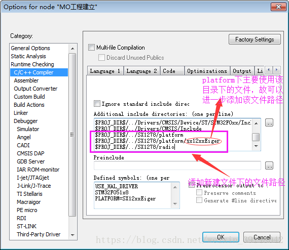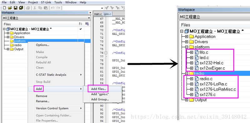 添加相关文件(platform文件中请将下图的sx1232-Hal.c换成sx1276-Hal.c,特此更正)