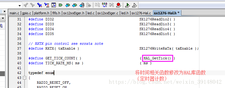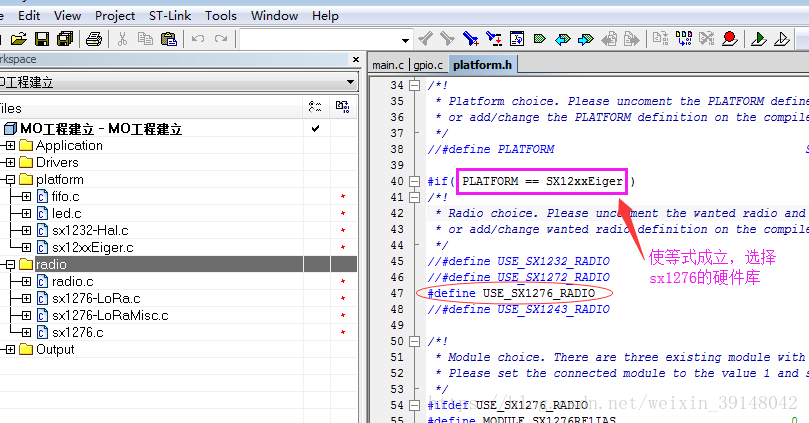 修改硬件平台:添加宏定义,选择sx1276的硬件库(platform文件中请将下图的sx1232-Hal.c换成sx1276-Hal.c,特此更正)