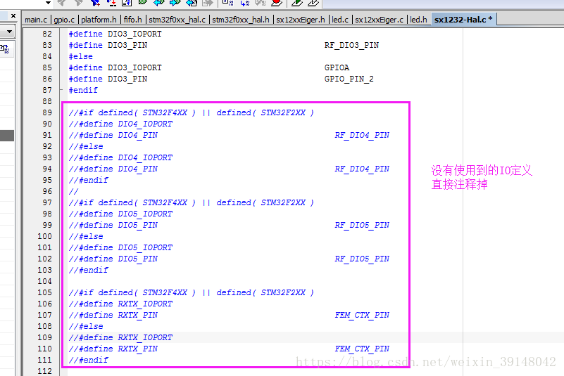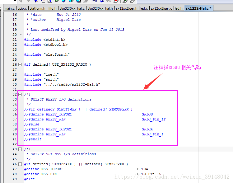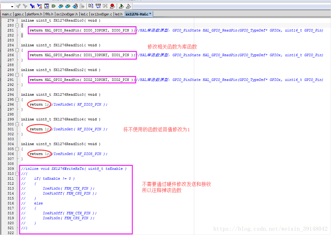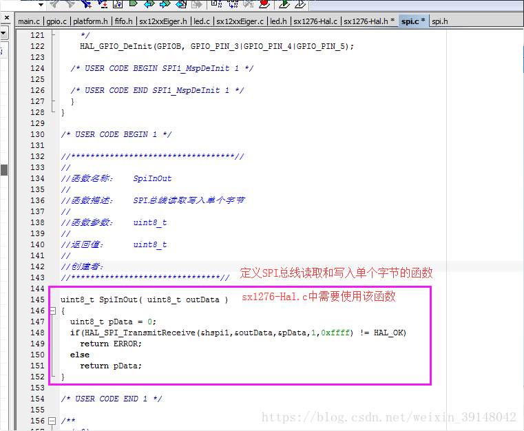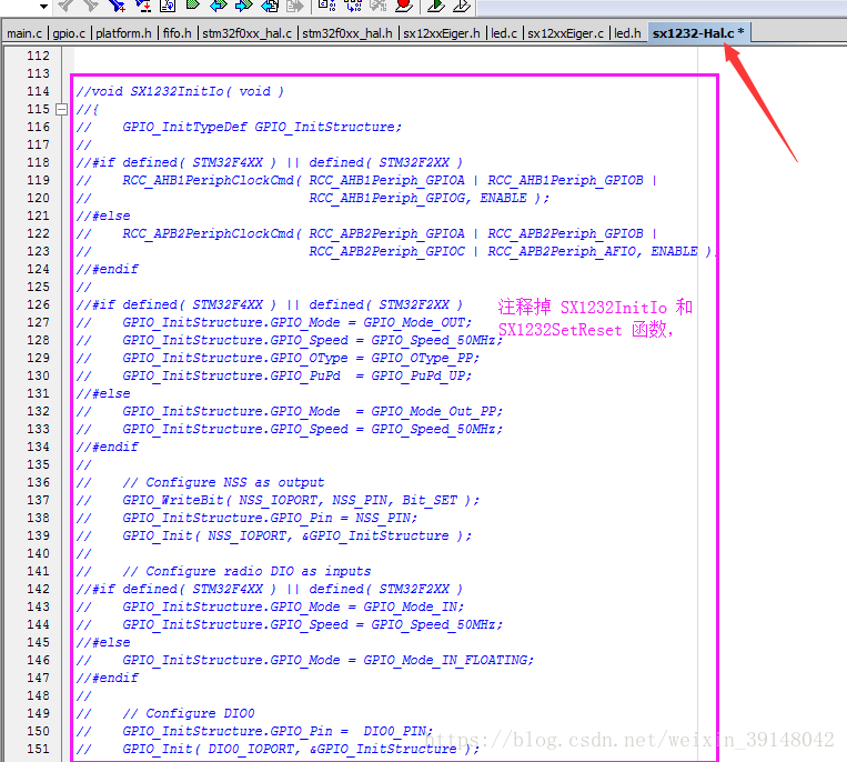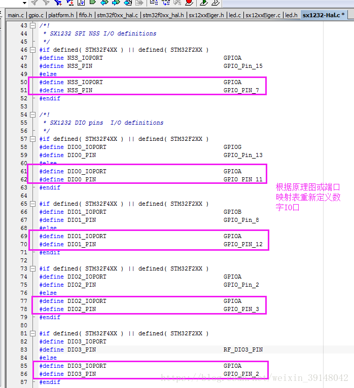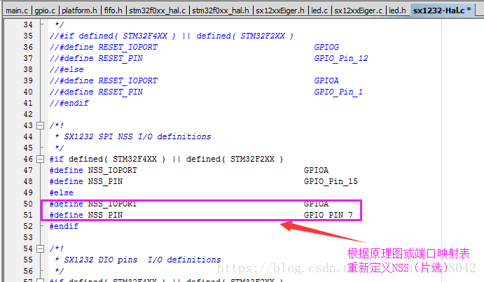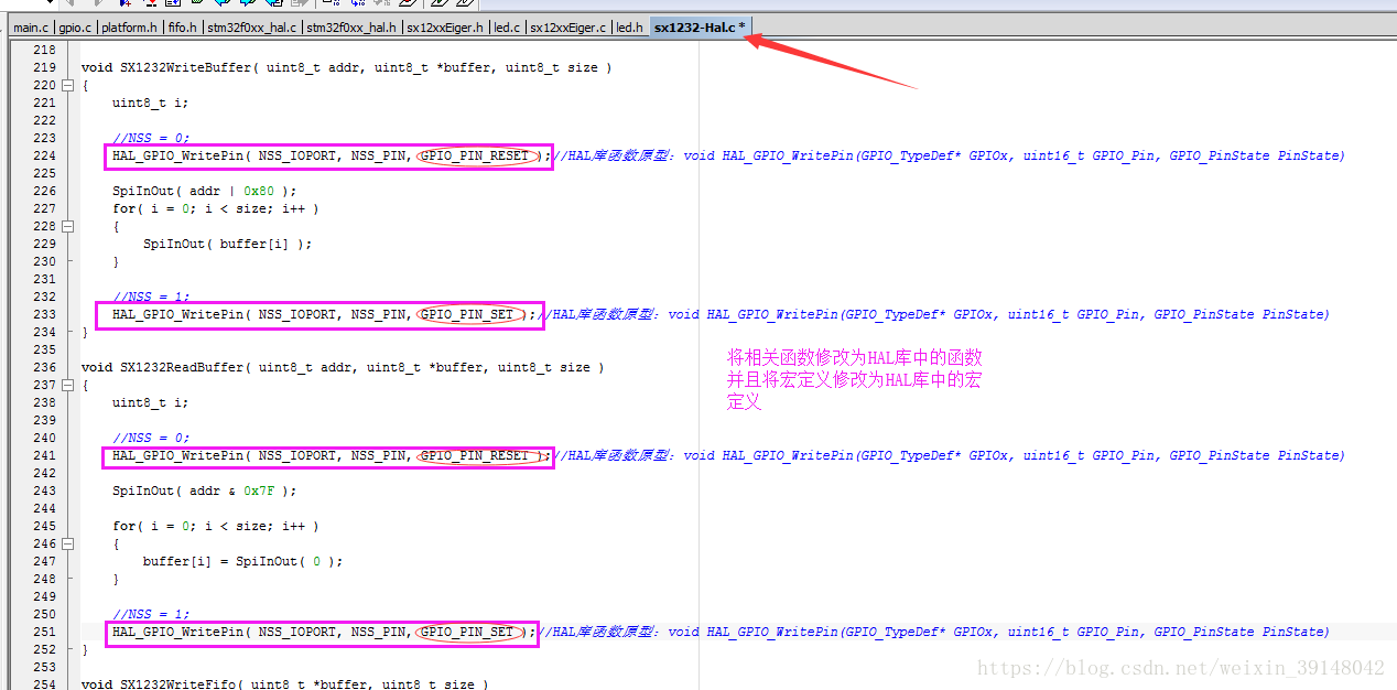修改sx1276-Hal.c(请将下图的sx1232-Hal.c换成sx1276-Hal.c,其代码修改方式一致,特此更正)