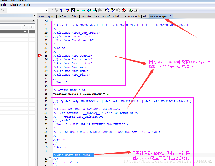 注释掉USB相关代码和初始化函数(先编译代码,然后根据错误提示修改)