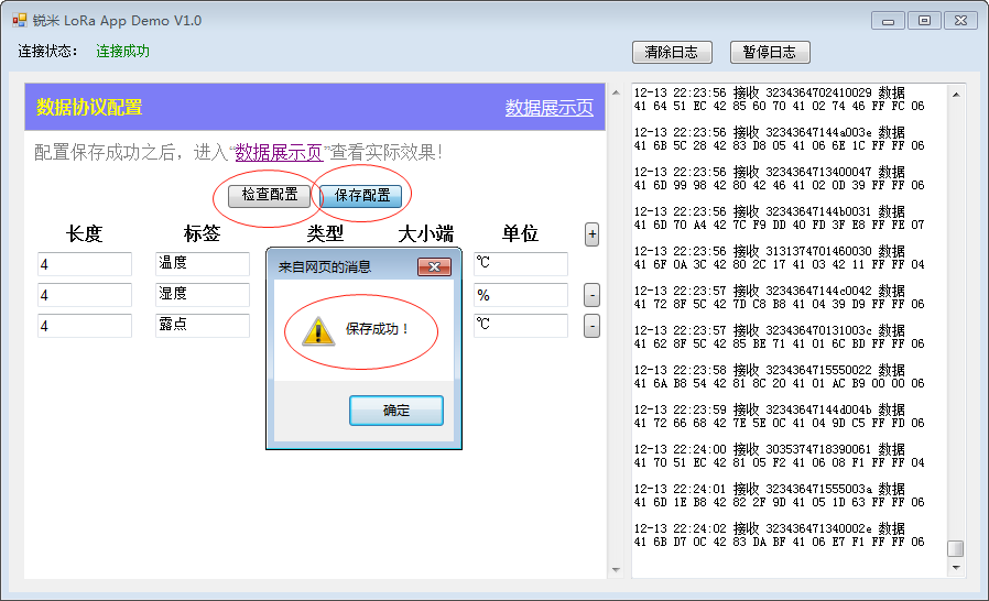 当设置完成后,可以通过“检查配置”来检测配置的信息是否符合规则。通过“保存配置”来更新配置,保存成功之后,就可以在“数据展示页”看实际效果了。当然,前提是已经参考 CSND RimeLink LoRaAppDemo@C# 博文 对数据连接进行了正常的配置。