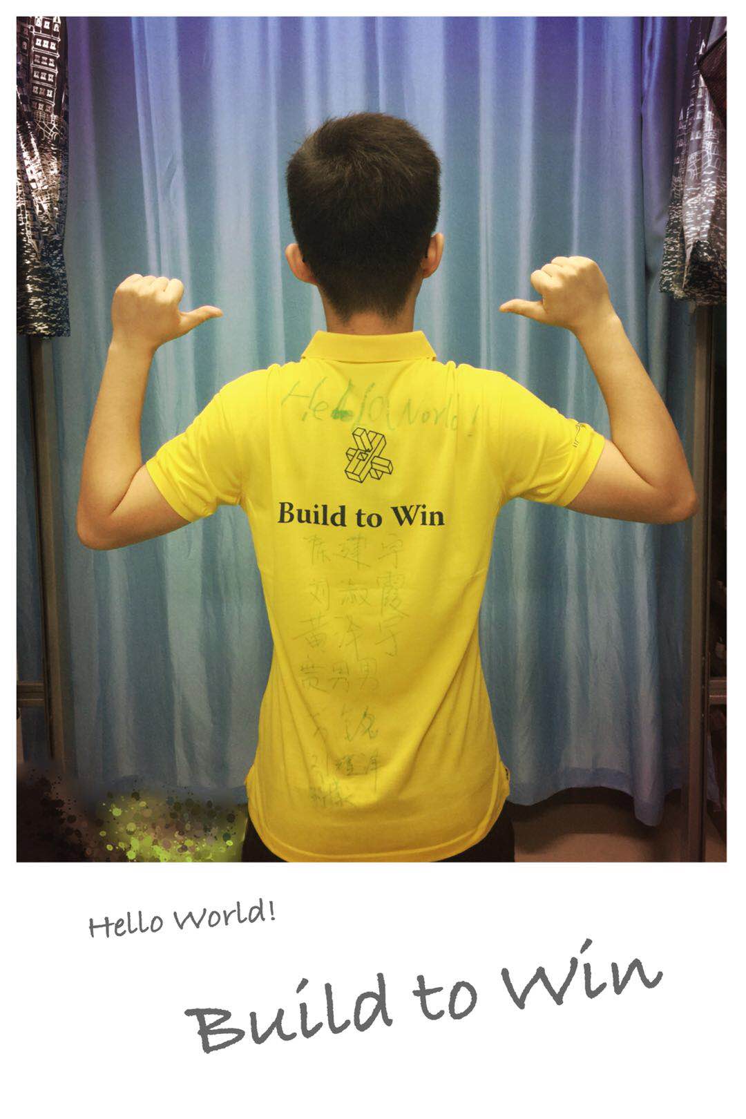 至此,大致简单表达了我的感谢,我也很庆幸可以和你们组成一个这样组内气氛活跃的小团队,在这段时间收获的不只是游戏编程的知识,更多收获的是同学之间深厚的友谊。我当时在课堂上突发奇想,我要把大家的名字写在这件小黄衫上,以后每每看到这件小黄衫就能想起曾经年少的我们有一个叫“Hello World!”的团队做了一个“空天猎”的小游戏。想起一起走过这段岁月的各位小伙伴。