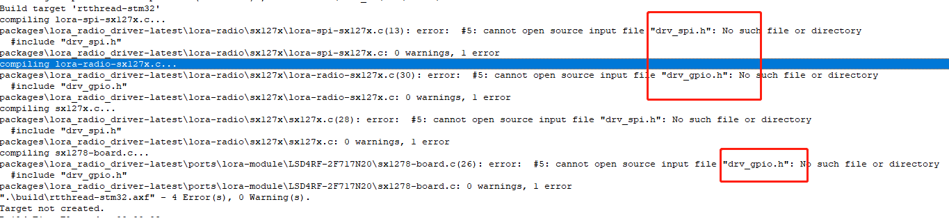 找不到drv_spi.h和drv_gpio.h,我们将其改为spi.h和gpio.h;原因:笔者这个工程使用的标准库,这个LoRa的包使用的HAL库。