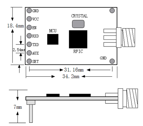 注意:EN,TXD,RXD,AUX,SET 都是3.3V 电平,如果用户是5V的MCU,为了稳定,建议做电平转换,否则容易丢包或者误码率高。 | ||