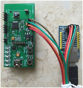 DEMO开发板的UART有4针:VCC、GND、TX和RX,分别与USB转串口适配器的4针:VCC、GND、TX和RX相连。实物连接图如下所示: