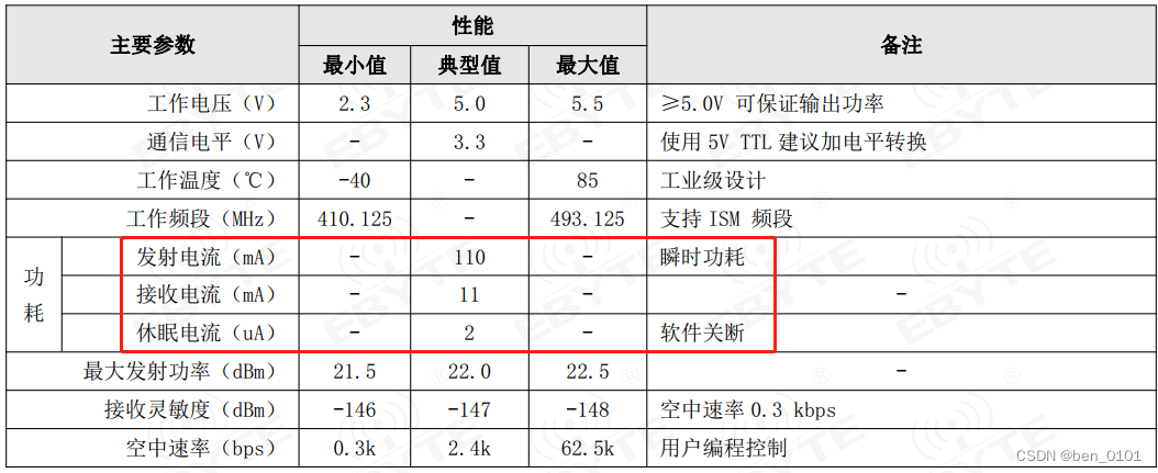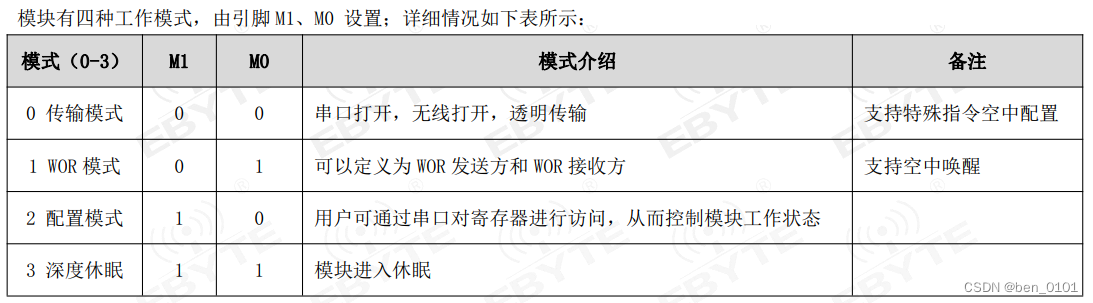 下图是从E22-400T22S模块规格书中截取的四种工作模式说明,以及个别功耗的典型值。