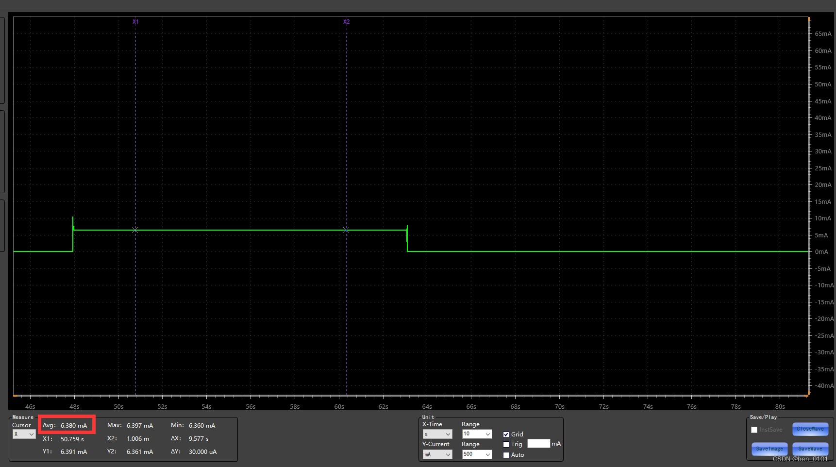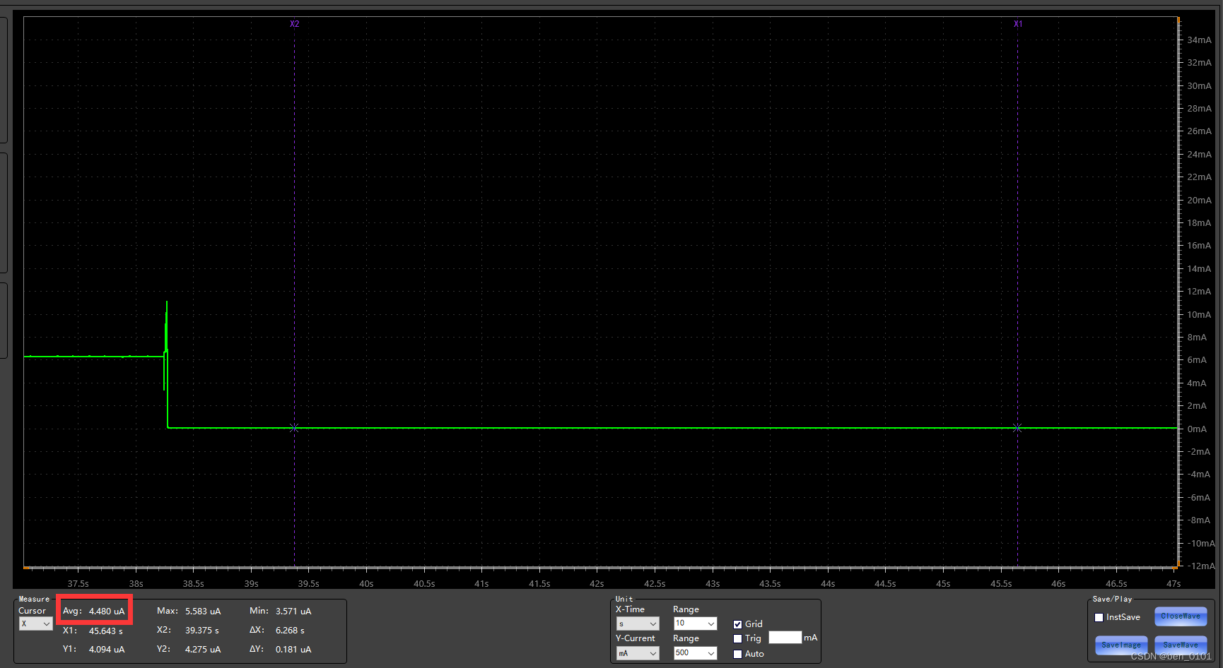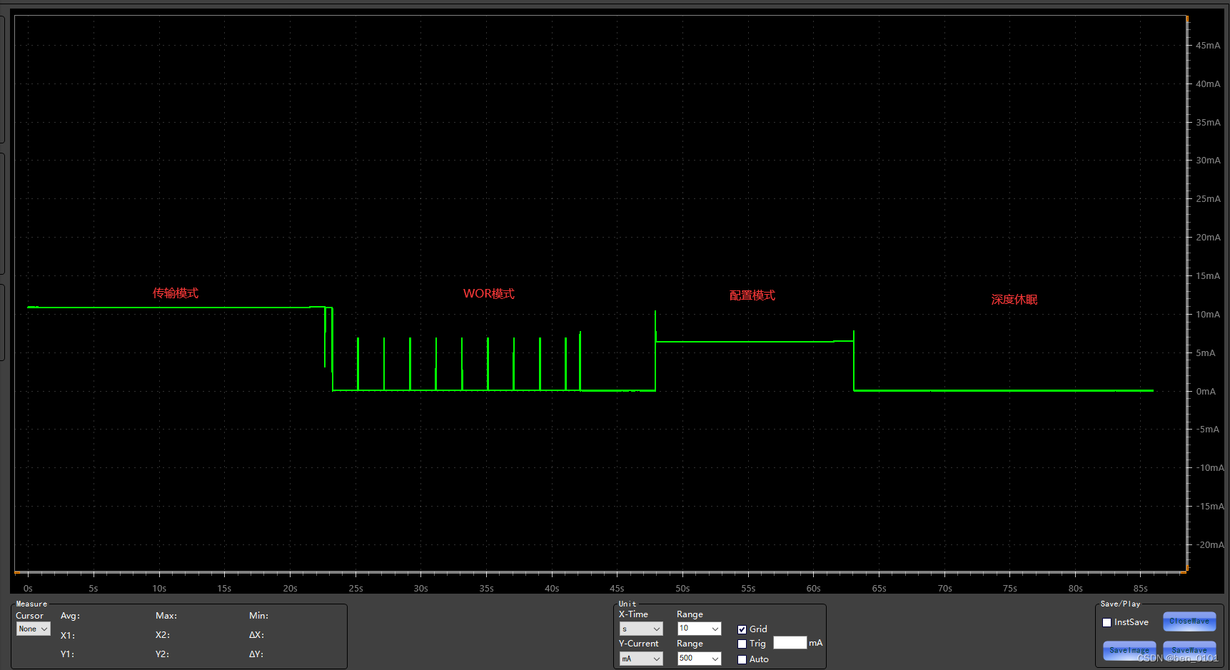 深度休眠(M0=1、M1=1):图中波形值为4.48uA。