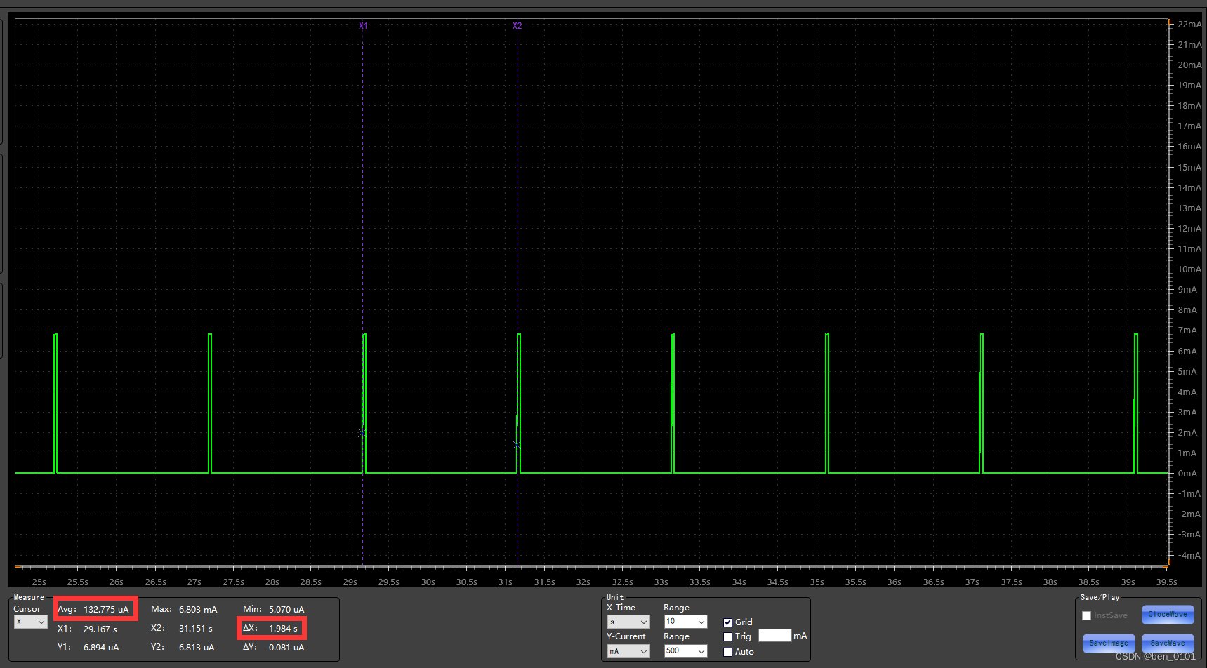 WOR模式(M0=1、M1=0):图中波形是周期为1.984s的脉冲,平均电流约为132.775uA。