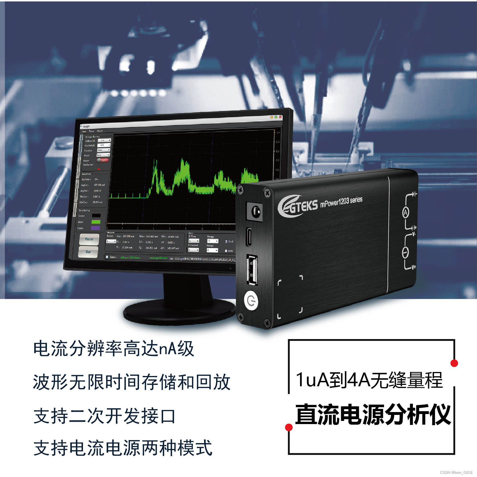 接下来我们先简单介绍一下需要使用的低功耗电流测试的仪器设备---mPower1203。mPower1203是由Egteks公司研发的一款测试设备,也是电流高精度测试仪器中为数不多的国产仪器。它是集便携式直流供电、高精度电流测试、动态电流波形显示分析以及高性价比为一体的直流分析电源,配合自带的软件工具,可实现待测产品/电路的动态功耗测试评估及分析,同时小尺寸的身材具有非常好的便携优势。
