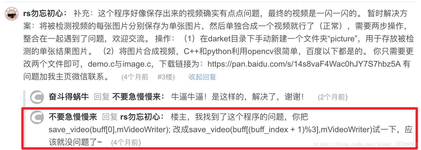 最近一段时间配置运行了下YOLO3网络,官方项目地址:https://pjreddie.com/darknet/yolo/,整个配置过程比较简单,按照上面那个网站操作就可以了。但是官网项目在测试本地视频或通过摄像头(webcam)获得的视频时,默认是没有保存运行结果的,因此这里主要讲的是如何保存yolo3运行检测的视频结果。有问题可以评论留言,算法没仔细研究,主要是讲述操作流程。