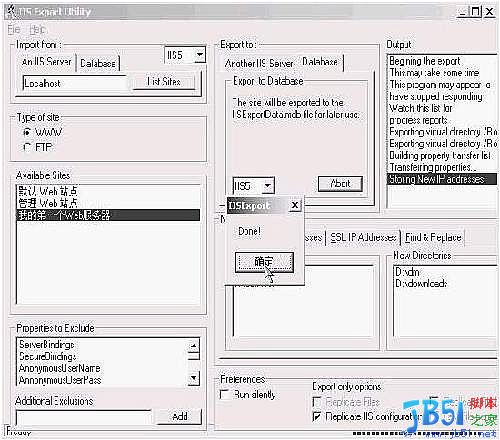 2、再在右“Export to”(输出到)下选择“Database”(数据库)窗口,确保左右两边均选择了正确的IIS版本(分IIS5和IIS4两种)之后单击其下的“Export”(输出)按钮,再根据提示进行操作即可备份成功。