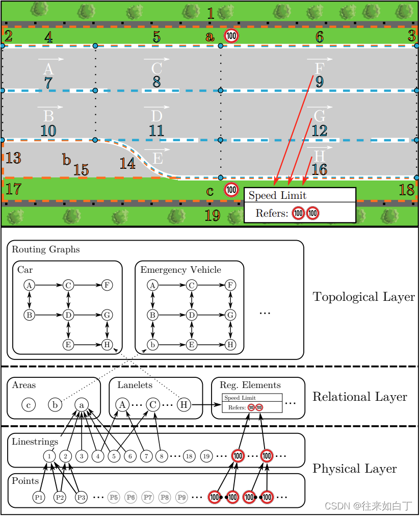- 物理层(physical layer,包含真实的,所有可以被观测到的地图元素,比如路面标记、交通灯、路边石头等等)
