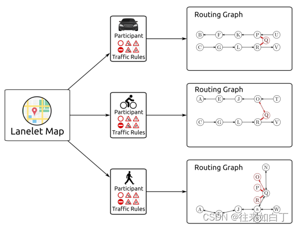 - 基于交规和参与者可以生成lanelet2的routing graph,这可以视为一个加权有向图:lanelet表示为点,lanelet之间的关系表示为边。各边权重可以用cost表示。